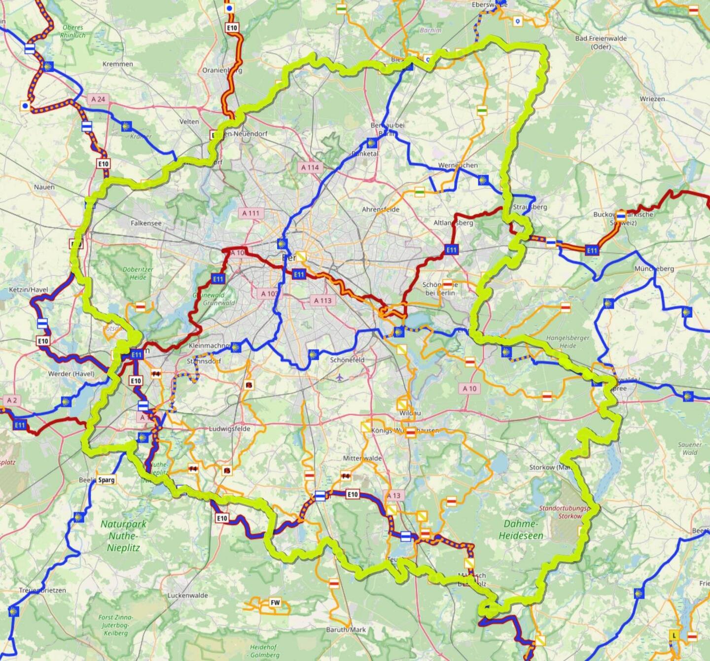 416km, 66 Seen und abwechslungsreiche Landschaften rund um Berlin, so zumindest die Werbung. Was er wirklich zu bieten hat werde ich dann ja ab Morgen erleben. Aus einigen Vids auf YouTube weiß ich zumindest schon mal, daß er einige Passagen hat, die mehr als den typisch Norddeutschen Kiefern-Monokultur-Wirtschaftswald zu bieten haben. Entlang der Briese soll es sehr viel Biber geben, der Gamengrund, eine Glaziale Rinne mit kleinen Seen wie an einer Perlenkette und schöner Landschaft und die Müggelspree. Ich bin wahnsinnig gespannt!