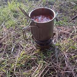 Zur Ausrüstung: ich hatte die große Bushbox XL mit großem Grillrost beides Edelstahl dabei, weil die am besten mit Kohlebriketts geht. Das Fleisch habe ich in meinem großen Stanley Thermo-Topf ~4,5l transportiert und darin mit Tiefkühlerbsen gekühlt. Ich hatte ihn mir zwar ursprünglich für warmes Mittag für die Arbeit geholt, aber er funzt so auch hervorragend als Kühltasche. So gut, daß die Erbsen nach 8 Stunden immer noch komplett gefroren waren. Dann hatte ich noch mein großes Tatonka Kochgeschirr (Campset Large) ohne den kleinen Topf innen drinnen dabei für die Erbsen und zum Kaffee kochen. Ansonsten nur die Verpflegung und einen Wechselsatz Unterwäsche und den Trangia mit einer Notfüllung von 200ml Spiritus als Backup. Trotzdem war es n ganz schönes Geschleppe😂 Ich war deutlich über den von mir favorisierten 14kg und war dementsprechend auch ganz gut k.o. nach den nur 18km. Aber es sollte ja auch mehr n Bushcraft-Microadventure werden als ein richtiger Hike. Jetzt genieße ich noch etwas den Platz alleine mit dem letzten Bier (Konterpilz🤣) und mache mich dann über die zweite Alternativroute, die ich ausprobieren wollte auf den Weg zurück nach Neustrelitz.