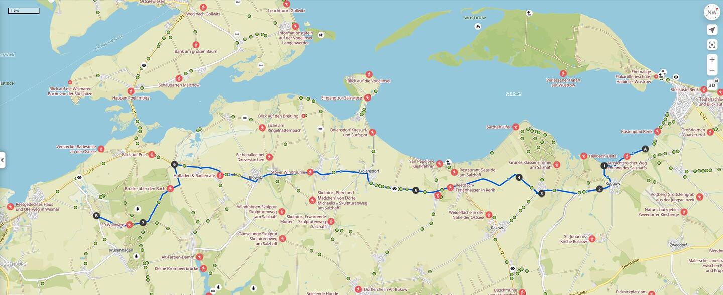 Die Radwege, also der Iron Curtain Trail/EuroVelo 13 bzw. Ostsee Küsten-Radweg, sind perfekt ausgeschildert! Vom E9, Hanseatenweg, Ostsee Küsten-Wanderweg siehst du alle paar km mal ne Flagge, kannste aber nicht nach laufen. Existiert also nur noch in teuren Wanderführern bzw. als GPX auf Waymarkedtrails.