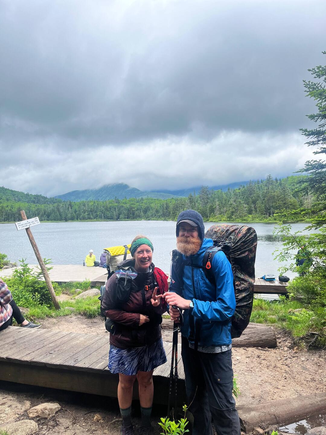 More highlights today- summiting the Kinsmens in the middle of a wicked rain cloud/storm, meeting Zig Zag and hiking with her for a few hours, hot soup and tea at the Lonesome Pond Hut. The sun coming out at 4pm ☀️😎 Setting up my tent on a platform (first time trying 🤞). I have a cool neighbor on the tenting platform- “HP” from Florida who is trying backpacking for his first time ever- long weekend for him.