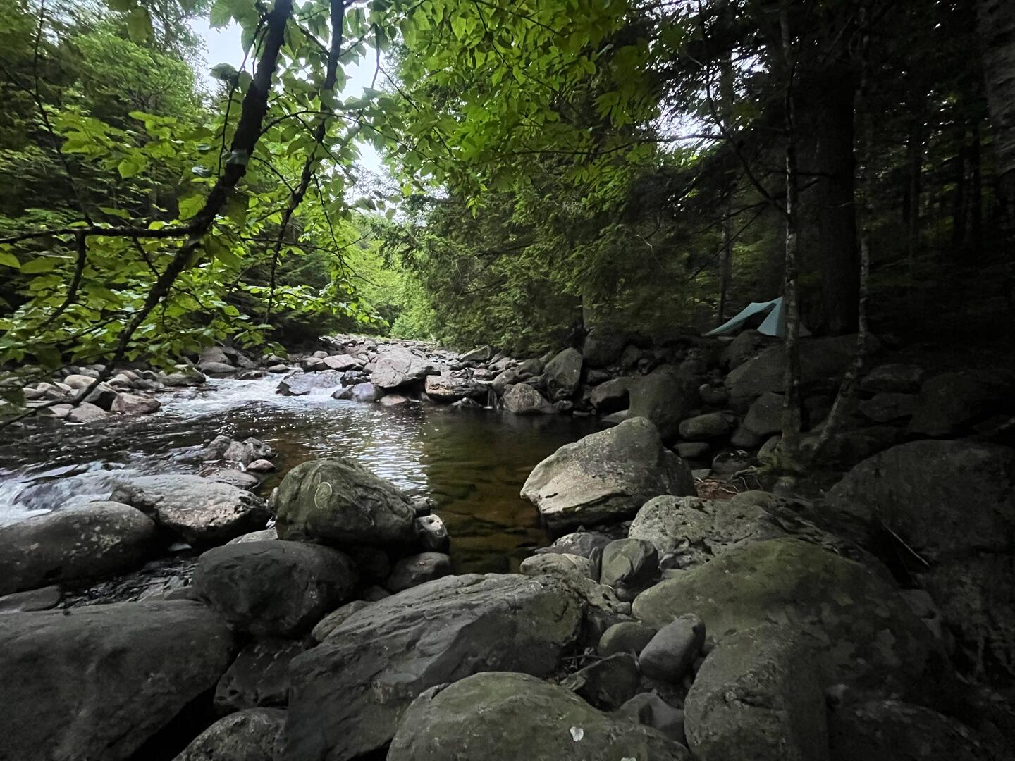 Look closely and you can see the tent perched up on the bank of this boulder strewn stream. The rushing water is a welcome and calming influence, although we are planning to be up early and hit the trails by 5:30am.