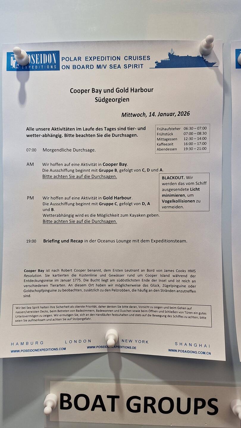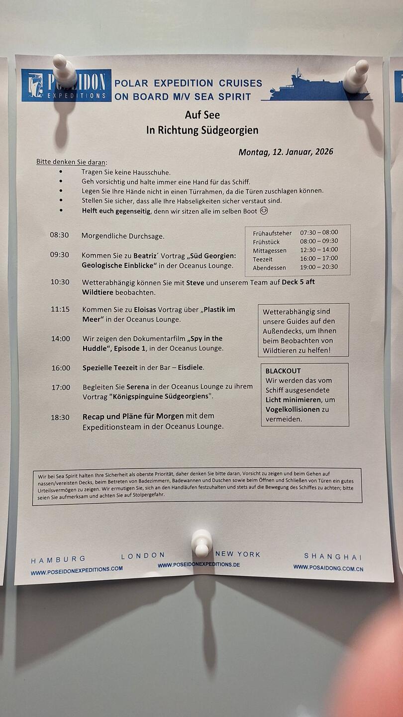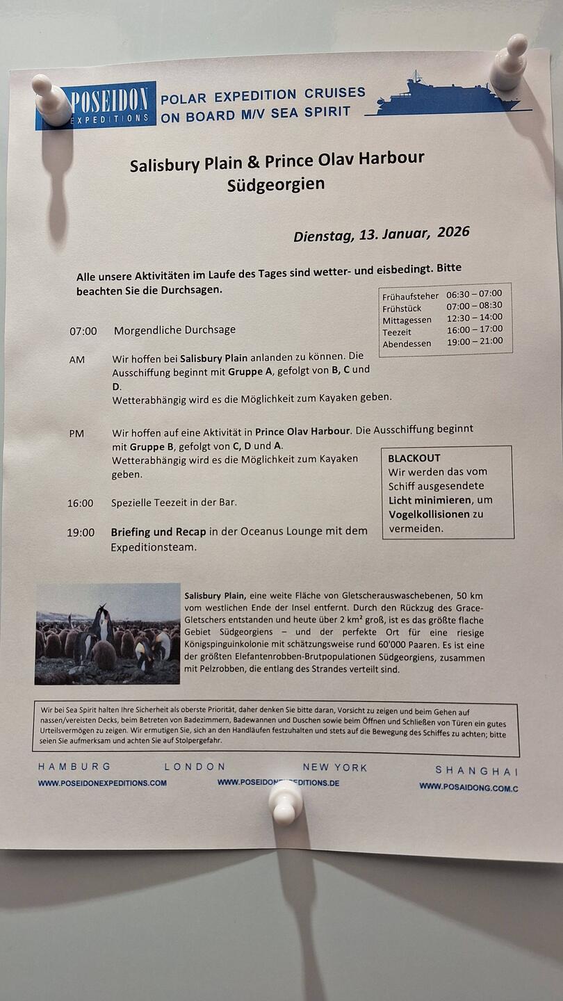 Es passiert heute nicht viel. Vormittags Vortrag über die Falklandinseln und anschließend das Briefing für Südgeorgien. Nachmittags wird wieder die Kleidung gereinigt (Biosecurity) die wir bei denRead more