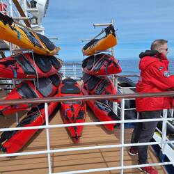 Das Schiff ist Bj. 1991, gut gepflegt, an manchen Stellen sieht man Rost, Es gibt keinen Mudroom, wie auf den neuen Schiffen, die Stiefel, Regenhose und Parka werden in der Kabine aufbewahrt.
