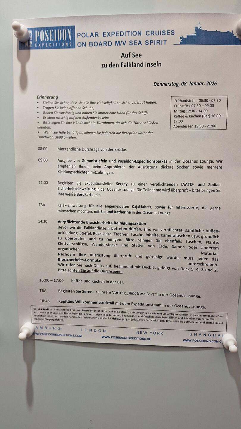 Nach dem Frühstück findet die Augabe der Expeditionsparka (darf behalten werden) und der warmen Gummistiefel (leihweise) statt. Danach werden die IAATO Regeln erklärt und die Verhaltensregeln imLæs mere