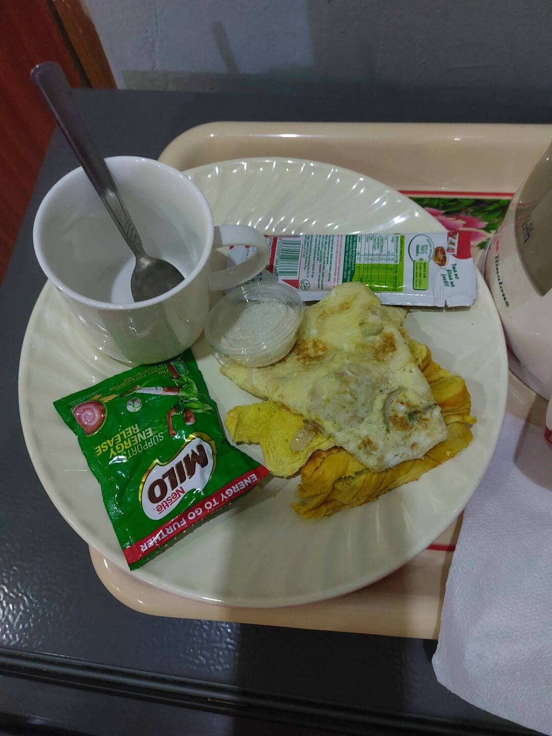Es gibt eigentlich immer Weißbrot, Omelett, Kakao- oder manchmal auch Nescafe-Pulver (hier aber nicht!) oder Tee.