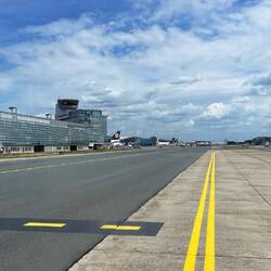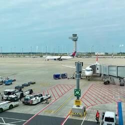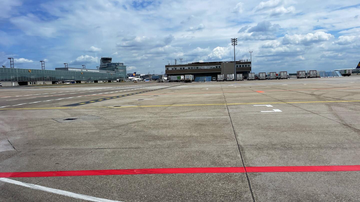 Vom Landeplatz ganz Aussen des Flughafen per Bus zum Terminal A.