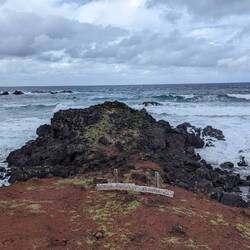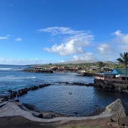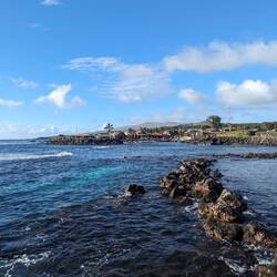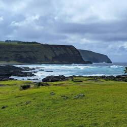 Akorát to má háček. Nic se tu nesmí navštívit bez průvodce - je nutné mít nějakého rodilého Rapa Nui s sebou. Tour s naším hostitelem Israelem však už máme zařízenou a tak se není čeho bát. Odsud jsme už pokračovali sami k bankomatu a odtamtud na pobřeží. Vlny narážely do skalnatého pobřeží s stříkaly až na chodník a v dálce bylo vidět pár začínajících surferů. My se tady cítili báječně a nejdříve jsme si chtěli dát welcome drink.