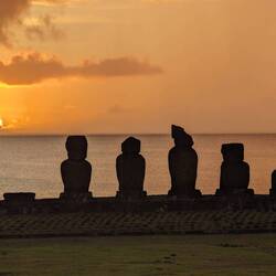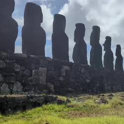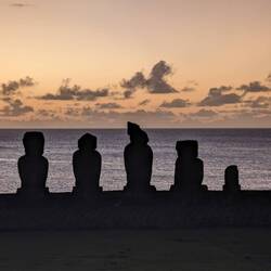 Dojeli jsme k Ahu Akivi, kde stojí 7 soch Moai a jako jediné na ostrově hledí směrem k oceánu namísto do vnitrozemí. Jedno z vysvětlení je, že symbolizují první objevitele ostrova spolu s Hatu Matu'a, kteří sem přijeli z Tahiti, a jejichž sochy také stojí u pláže Anakena. Jejich pohled prý směřuje přímou čarou směrem k Tahiti, což by tuto teorii potvrzovalo.