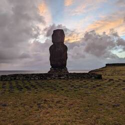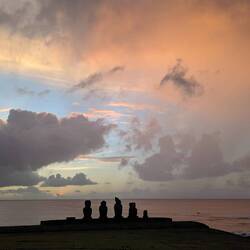 Nic víc nám na dnešek nezbývalo a tak jsme šli opět sledovat západ slunce. Tentokrát jsme měli lepší počasí a nebylo tolik zataženo. To však tady na ostrově nic neznamená, protože během půl hodiny může několikrát začít a zase přestat pršet a mezitím svítí slunce. Takhle divné a rychle měnící se počasí jsme ještě nikdy nezažili. Naštěstí nám dnes vydrželo a my mohli sledovat, jak se nebe barví si oranžova a slunce mizí za obzorem a jako kulisu k tomu jsme měli sochy Ahu Tahai.