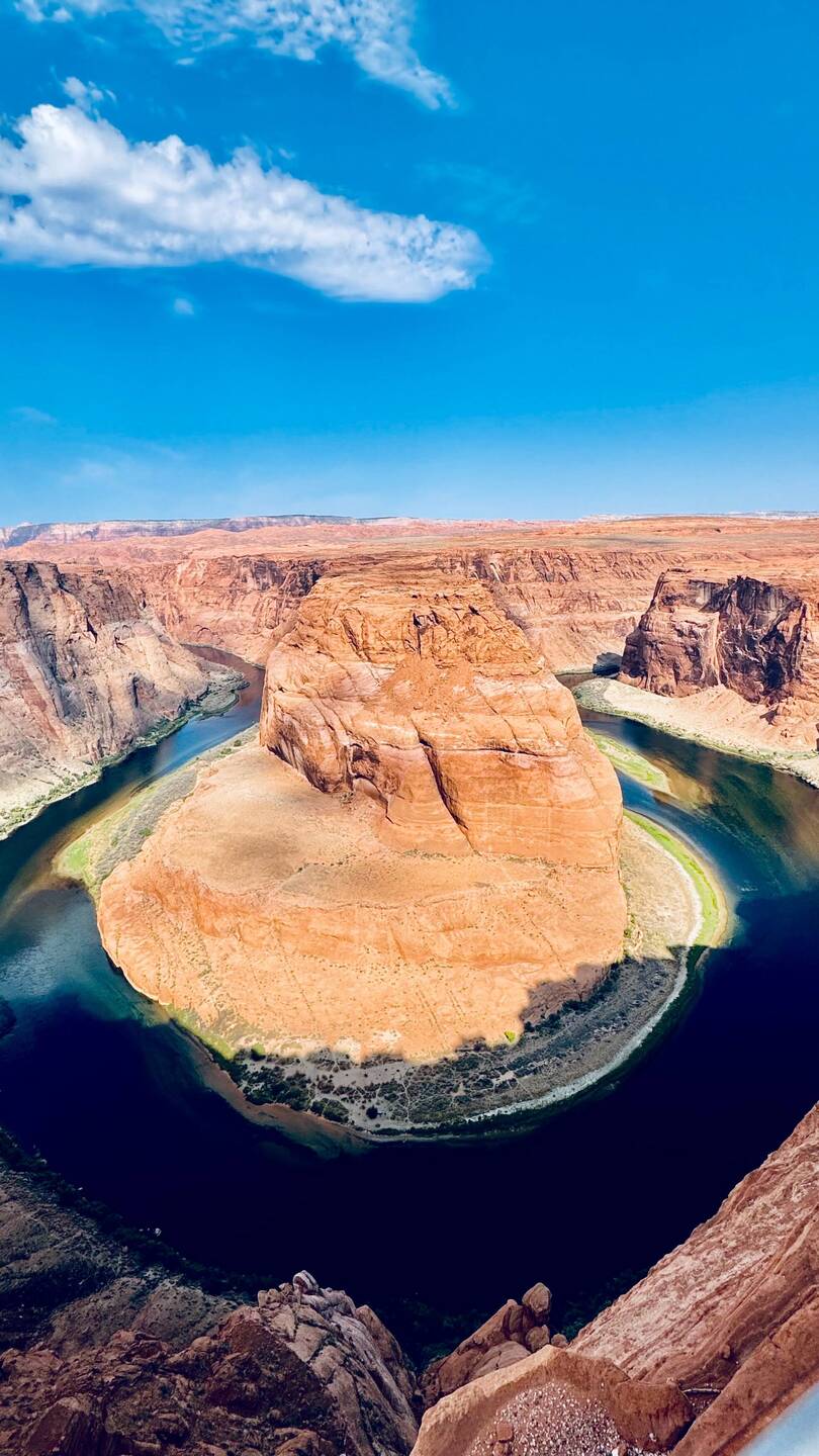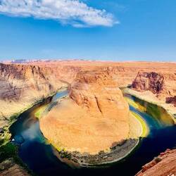 Départ ce matin de Page en Arizona. Petit trail pédestre avec chaussures de moto et sans eau, sous un soleil de plomb même à 8h30 du matin, pour aller voir Horshoe Bend, une ouvre magnifique de la nature, en forme de fer à cheval.