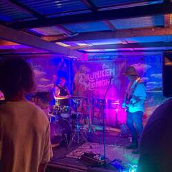 While the storm gets stronger, Julia and Alexandra join the people at the drum circle next to the Brunswick beach under a roof.