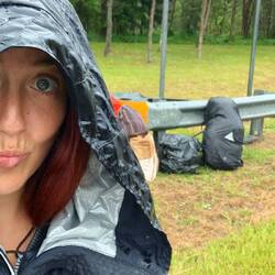 Alexandra and Julia are hitchhiking in rain and thunderstorms until about 1 pm. Close to the Highway they overcome their tired bodies by reconnecting to themselves and the elements and ask for the next step to show up quicker.