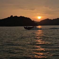 Op geveven moment gingen we weer varen en kwamen de mooie kleuren van de zonsongergang weer naar voren in de lucht. Het was wel een beetje bewolkt en door de bergen op de eilanden zagen we niet veel van de ondergaande zon. Ook zagen we wat bliksem in de verte. Na wat gegegeten te hebben bij een restaurantje in de buurt reden we in de stromende regen terug naar onze accommodatie.