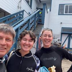 Also schwammen wir los und bekamen von Sören noch eine kleine Einführung ins Kraulen. Kurz vor der hälfte der Runde von etwa 1,5 Kilometern – sahen wir sogar einen Seelöwen und ein paar Kormorane im Wasser. Die ganze Runde war uns dann aber doch zu viel, also schwammen wir wieder zurück. Was uns zwischendrin sehr erheitert war der immense Auftrieb des Neoprenanzugs der dazu führte das wir ganz gelassen auf dem Bauch oder dem Rücken treiben konnten ohne uns bewegen zu müssen. Wie Otter mit ihrem Lieblingsstein. Nach rund 40 Minuten im arschkalten Wasser reichte es uns vollkommen.
