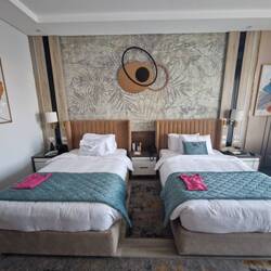 Da es ansonsten leider auch keine Hippo-News gibt, noch eine kurze Highlightstory vom ersten Tag hier: bei der Anreise im Hotel konnten wir uns aussuchen ob großes Bett oder 2 Einzelbetten, wir wählten Einzelbetten, doch das war anscheinend an diesem Abend (wir kamen ja doch erst um 22.30Uhr an) nicht möglich. Wir dachten, dass sonst kein Zimmer mehr frei war, aber der Rezeptionist meinte: ab morgen kein Problem. Alles klar, wir dachten, dass wir dann ein anderes Zimmer bekommen - aber nein falsch gedacht, während Eva gerade Videocalls machte und Steffi ihre Nädel machte tauchten 2 Arbeiter auf, die das Bett komplett auseinander nahmen und 2 einzelne Betten wieder aufbauten (die Betten bestanden aus massivem Holz und waren demensprechend schwer). Innerhalb von 30min hatten die unser Zimmer umgebaut.