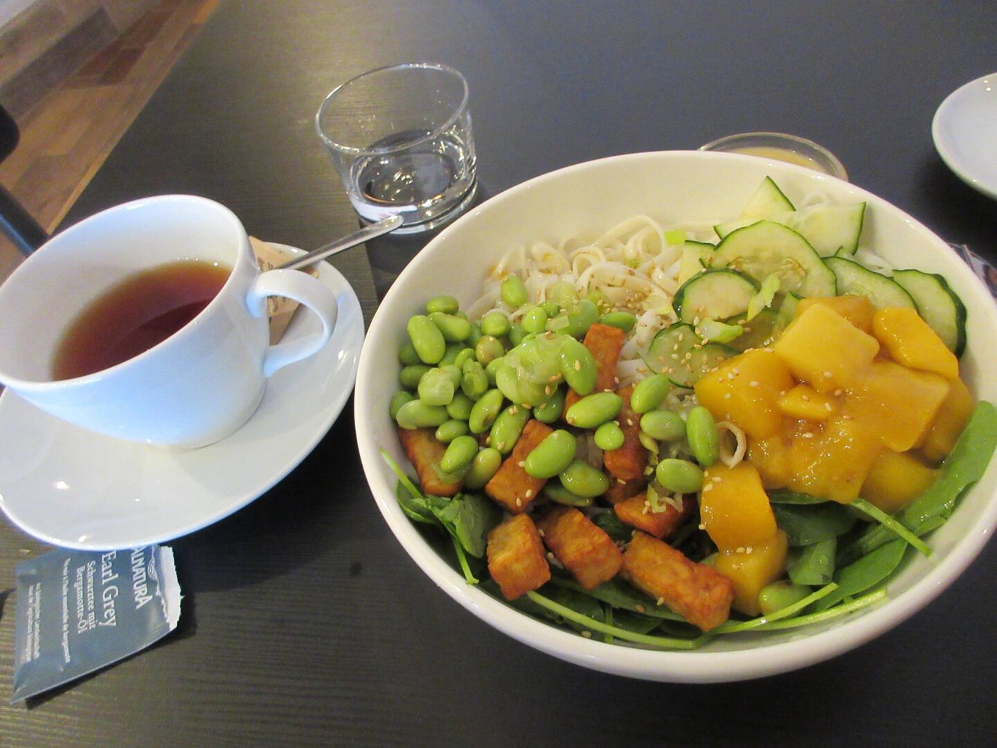 Essen! Udon Nudeln mit Tempeh, Mango, Spinat, Edamame, Gurken und Erdnuss-Sauce. Überraschenderweise kalt serviert. Nicht so gut wie im vEATnam in Villach, aber auch gut :)