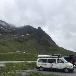 Viele Stops haben wir gemacht, die Orte auf uns wirken lassen. Auf einer Nebenstraße hat ein Rallyeteam die Kontrolle verloren und ist in den Graben gerutscht. Der Grünstreifen neben der Fahrbahn war nicht fest, ein Ausweichen vor dem Gegenverkehr war der Auslöser. Der T4 Bus war über 45Grad schief und drohte umzukippen. Aber zum Glück war niemand verletzt. Das Team hat den norwegischen Pannendienst verständigt, vermutlich kann nur ein Kran helfen, das der Bus nicht komplett auf die Seite fällt. (Edit: abends haben wir erfahren, das zwei BSC Teams den Bulli rausgezogen haben. Einer zum Sichern, der Andere zum Ziehen, mit Seilwinde) . Zusammenhalt und Teamgeist wird hier groß geschrieben!