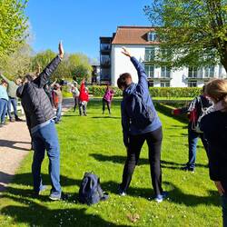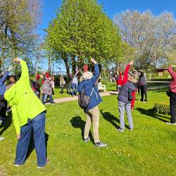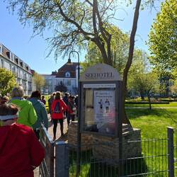 Mit der Straßenbahn zum Bahnhof Neustadt. Dort haben wir uns, 12 Frauen, zur Abfahrt mit gebuchtem Bus getroffen.