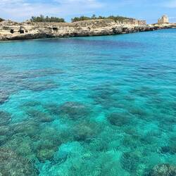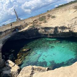Aamulla matkalla Leccesta ostettiin paikallisia 🍒🍑 Ensimmäinen pysähdys Grotta della Poesia. Olipas sininen vesi🥹 Ei olla ikinä nähty niin puhdasta sinista vettä. Leuca oli saappan koronLæs mere