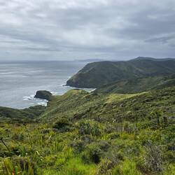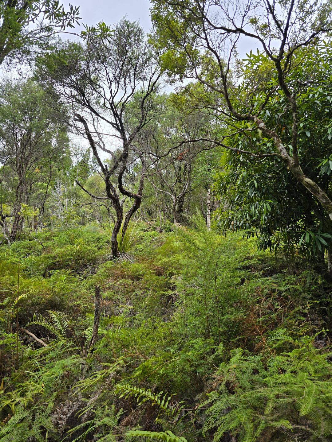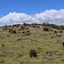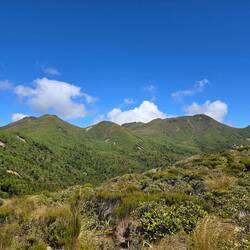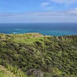 Irgendwann hat das Elend ein Ende und nachdem wir aus dem Unterholz kommen, können wir ein kleines Stückchen der Spitze des Taranaki sehen, der sich immer noch hinter einem Berghügel versteckt.
