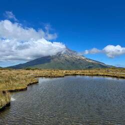 Wir wandern noch eine Zeit weiter, um zum Pouakai Tarn zu kommen. Dabei handelt es sich um einen See, in dem man an windstillen Tagen eine Reflektion des Taranaki im Wasser beobachten kann.