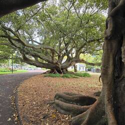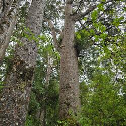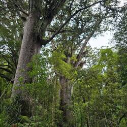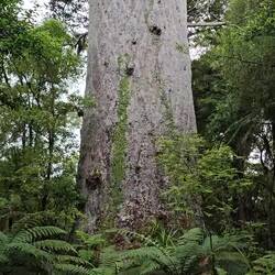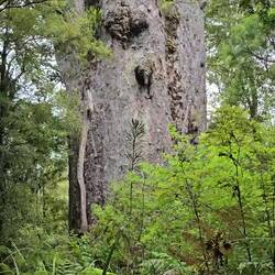 Nach einem kurzen Spaziergang über einen Pfad und später Bohlenweg, auf denen wir bereits viele Bäume bestaunen können, kommen wir schließlich zu Te Matua Ngahere "Father of the Forest", dem zweitgrößten Kauri-Baums der Welt.