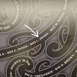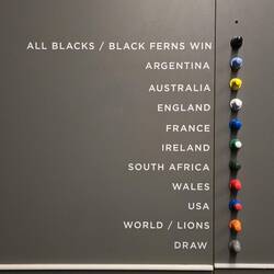 Weiter geht es durch einen Raum, auf dessen einer Seite ein fließendes Ornament zu sehen ist, auf dem alle All Blacks Spieler und Black Ferns Spielerinnen namentlich und mit ihrer Nummer vermerkt sind. Dieses Ornament zieht sich durch alle Räume und symbolisiert, dass alle Spielerinnen und Spieler miteinander verbunden sind.