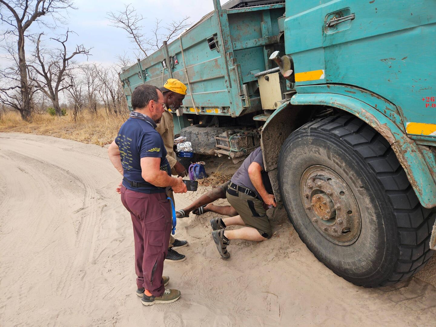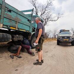 Ausser mit Essen und Wasser konnten wir nicht helfen. Ohne Satelliten Telefon bist aufgeschmissen. Zettel mit Telefonnummer vom Boss, Foto vom kaputten Lager und dann nix wie ab Richtung Gate. HierBaca lagi