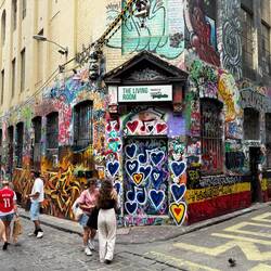 Zum Abschluss spazierten wir durch die berühmte Hosier Lane, deren Wände nahezu vollständig mit Graffiti bedeckt sind. Die Straße ist ein wahrer Magnet für Touristen, die die Kunstwerke ausgiebig fotografieren und sich selbst davor in Szene setzen.