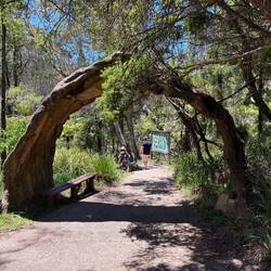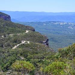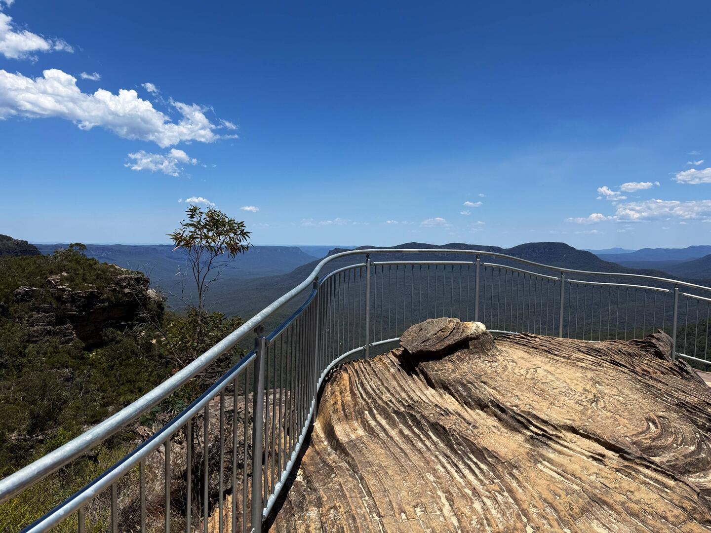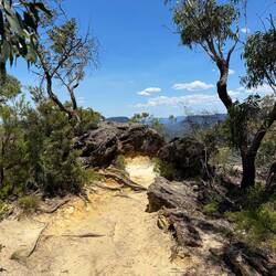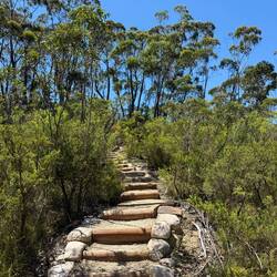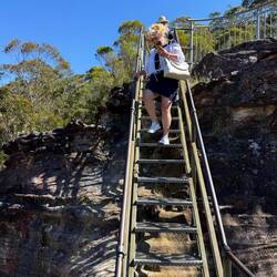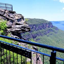 Es folgte eine lange Wanderung durch die Blue Mountains bei heißen 33 Grad, mit unendlich vielen Stufen bergauf und bergab. Unsere Wasserflaschen leerten sich rasch. Die Anstrengung wurde mit herrlichen Ausblicken belohnt – die Landschaft erinnerte mit ihrem Charakter stellenweise an das Elbsandsteingebirge.