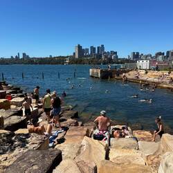 Über die Pyrmont Bridge ging es weiter, immer entlang der Piers, bis nach Barangaroo. Dort spazierten wir durch den Barangaroo Reserve Headland Park – ein faszinierender Ort, an dem sich Natur und moderne Stadtarchitektur verbinden. Besonders überraschend: badende Gäste mitten in der Stadt, unweit der Harbour Bridge.