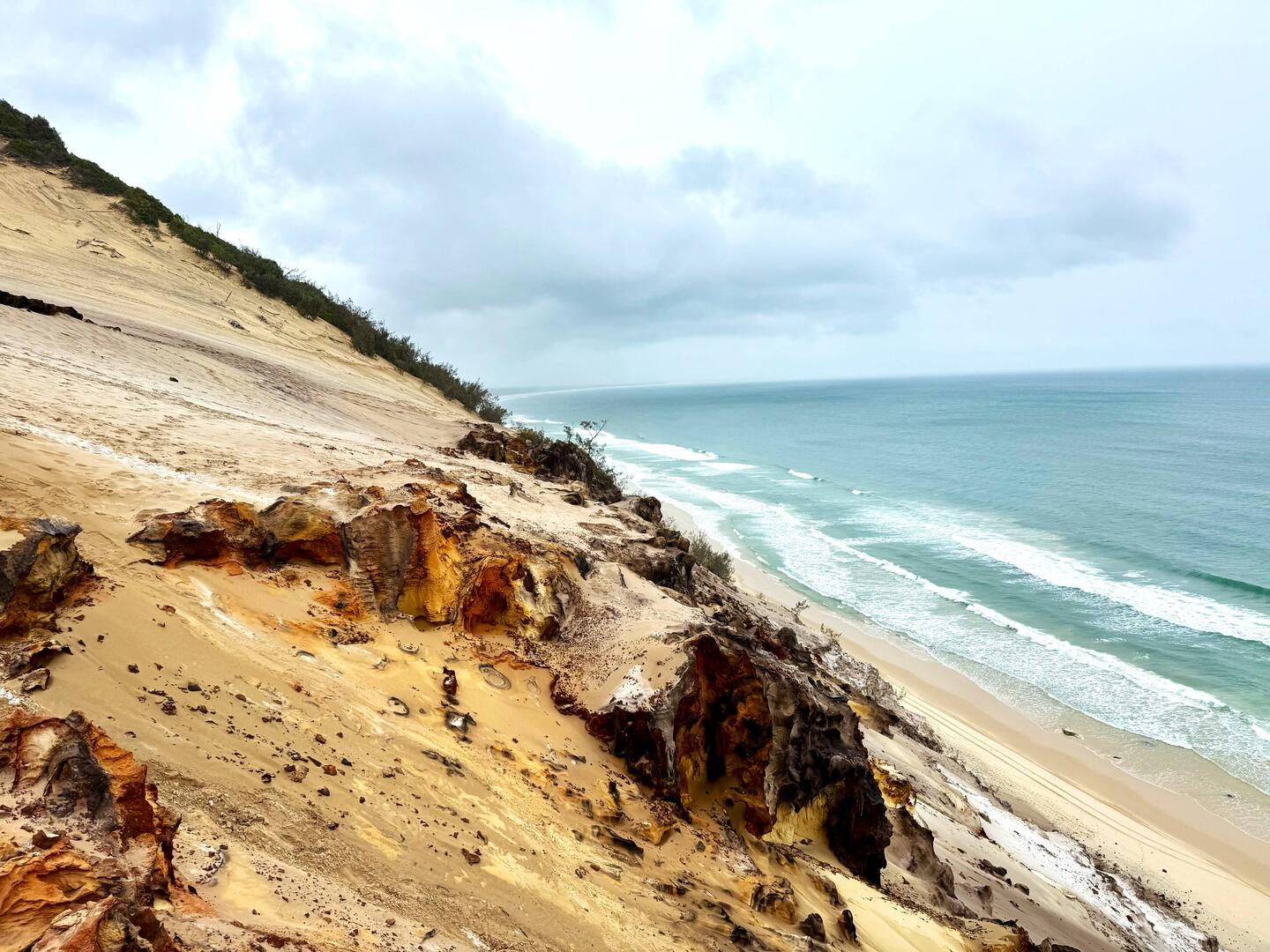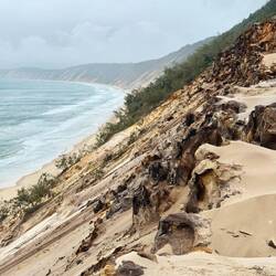 Rainbow Beach ist bekannt für seine farbenfrohen Sandklippen, in denen sich verschiedene Gelb-, Rot- und Orangetöne abzeichnen. Besonders beliebt ist der Ort bei Strandliebhabern und Offroad-Fahrern, denn hier gibt es eine direkte Zufahrt für Fahrzeuge auf den Strand. Leider durften wir mit unserem Fahrzeug nicht hinunterfahren, da wir keinen Allradantrieb hatten. Mit einem 4WD wäre es sogar möglich, direkt von Noosa aus am Strand entlang bis nach Rainbow Beach zu fahren – ein echtes Abenteuer, leider für uns diesmal nicht.