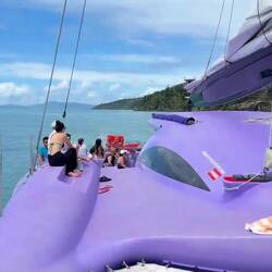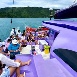 Wir sichern uns einen Platz im Trampolinbereich des Katamarans. Unter uns schimmert das Meer in Azur, über uns läuft aus den Lautsprechern mein Lieblingssong Money for Nothing von den Dire Streets. Immer wieder schießen Schnellboote vorbei – vermutlich Wassertaxis nach Hamilton Island. Währenddessen beginnt der Bordservice: heiße und kalte Getränke, frisches Obst, Kekse. Die perfekte Einstimmung auf einen Tag im Paradies.