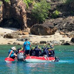 Nach einer kurzen Fahrt zum Hafen erfolgt der Check-in auf den größten Segelkatamaran, der in dieser Region unterwegs ist – ein schwimmender Riese, der dennoch elegant durch die türkisfarbenen Wasser gleitet. Noch vor dem Ablegen erhält jeder Passagier einen Stingersuit. In diesen Gewässern ist das kein modisches Accessoire, sondern Lebensversicherung: