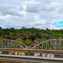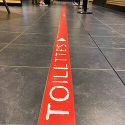 Auf einer Raststätte haben wir eine kurze Pipipause eingelegt, wir haben die Toiletten gesucht und immer an die Decke nach Beschilderungen geguckt, bis Anne gesehen hat, dass dort ein FETTER roter Streifen am Boden war auf dem Toilette und Pfeile abgebildet sind. 💩🤝🏼