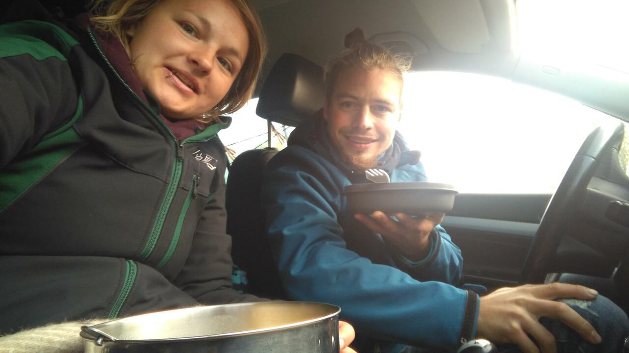 Da es - 1 Grad ist, heizen wir das Auto und Czytaj więcej