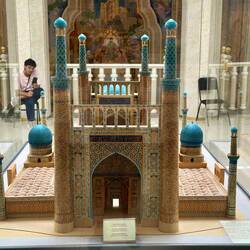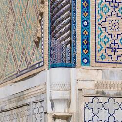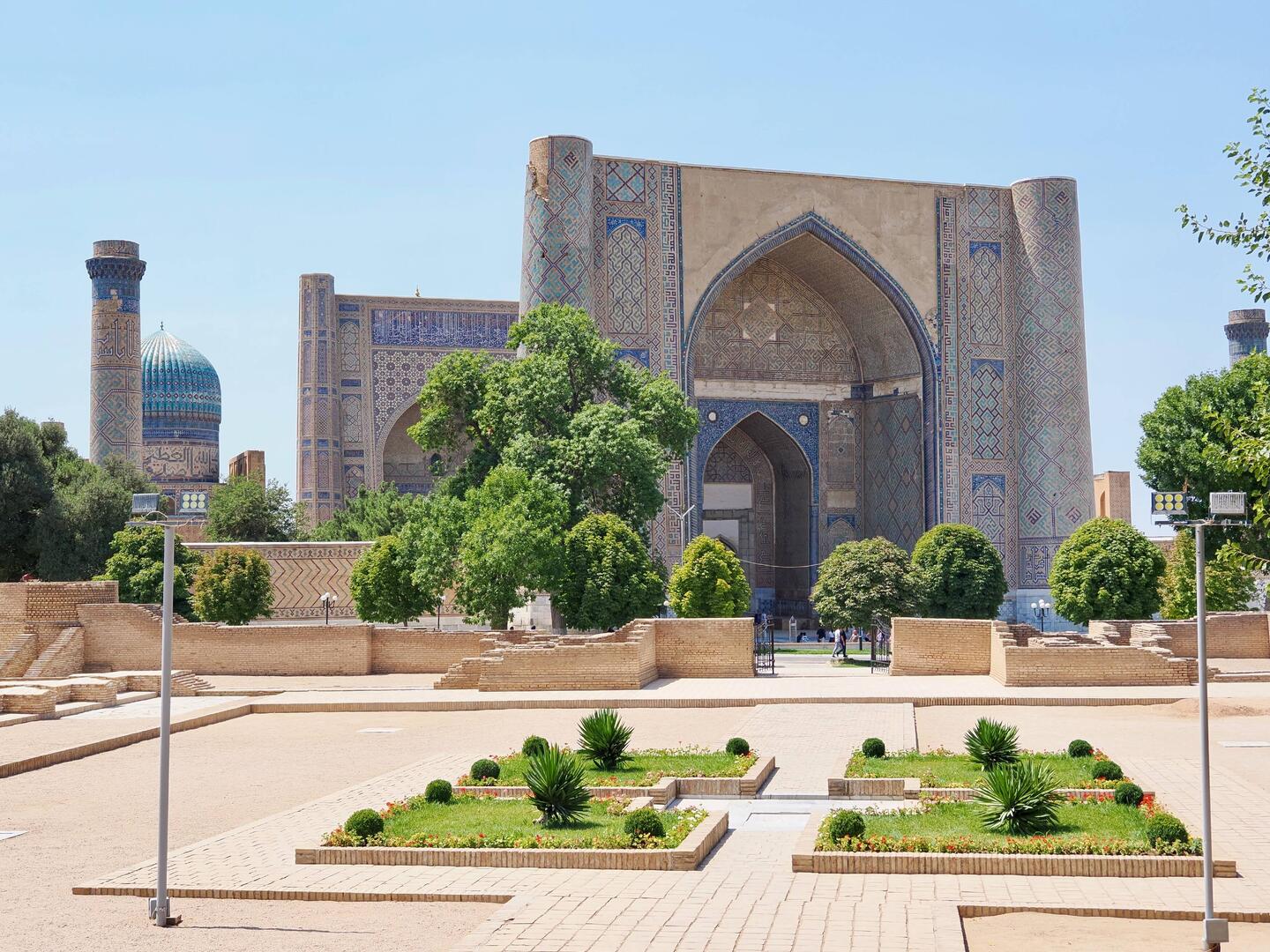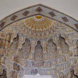 Nach einem späteren Feldzug in Indien hat Amir Timur den Bau einer für seine Zeit gigantischen Moschee begonnen. Es wird gesagt, dass er in Indien eine sehr große Moschee gesehen hat und er wollte eine größere. Von seinen Feldzügen hat er er nicht nur Reichtümer mitgebracht, sondern auch Wissenschaftler, Architekten und Handwerker, es gab also Geld, Wissen und Können und das hat über die Zeit einen neuen Baustil in seinem Reich hervorgebracht.