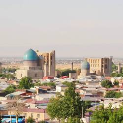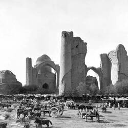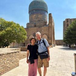 Unser erstes Ziel in Samarkand ist die nach Bibi Chanum benannte Moschee. Bibi-Chanum war eine der Frauen von Amir Timur. Sie war eine Nachfahrin von Dschingis Khan und das gab seinem Ziel, das mongolische Reich wieder zu errichten Legitimation. Sie kamen zusammen durch Eroberung - in seinen frühen Feldzügen hat er auch den ersten Eheman von Bibi-Chanum besiegt und umgebracht und hat sie aus seinem Harem zu sich genommen. Ein auch schon bei den Mongolen übliches Verfahren.