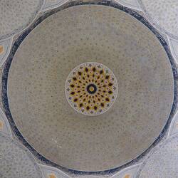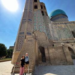 Wenn er anwesend war, hat er sich intensiv in den Bau eingemischt. Da er aber auch öfters auf Reisen war, um andere Länder zu erobern, hat seine Frau Bibi Chanum wesentlichen Anteil an der Gestaltung. Genau gegenüber hat sie zur selben Zeit eine Madrasa errichten lassen, eine Hochschule, wo sie heute begraben liegt, oder auch nicht und das nach ihr benannt ist. Als Timur nach einer seiner Reisen zurückkam, musste er feststellen, dass das Hauptportal der Madrasa höher war, als das der Moschee - das ging gar nicht. Also ließ er das Portal abreißen und neu und höher wieder erbauen.