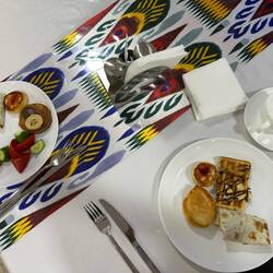 Wir haben ein Hotel im Wohnviertel der Altstadt von Samarkand genommen. Die Lage gefällt mir wirklich sehr. Kinder spielen draußen, die Anwohner gehen einkaufen, unterhalten sich mit den Nachbarn – und ganz in der Nähe wird gerade ein neues Haus gebaut. So kann ich genau beobachten, wie hier kleinere Neubauten entstehen. Das finde ich richtig spannend.