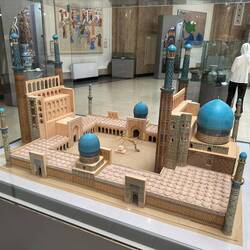 Auf den Fotos mit dem Modell dieser Moschee, die wir in Taschkent aufgenommen haben, kann man die Struktur dieser Art Moscheen erkennen. Es gibt vorn ein prunkvolles Eingangsportal, durch das die Gläubigen in den Hof gelangen. Gegenüber ist der Hauptraum der Moschee mit der großen türkisblauen Kuppel, der aber viel zu klein ist, um alle Gläubigen aufzunehmen. Deshalb gibt es in den vier Ecken überdachte Bereiche, in denen die Großzahl der Gläubigen beten konnte. Diese Dächer wurden von einer großen Zahl von Säulen getragen und hatten oben viele kleine Kuppeln. Diese Dächer sind alle eingestürzt und nicht restauriert.