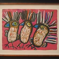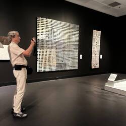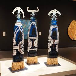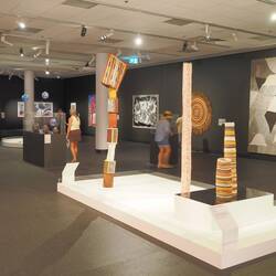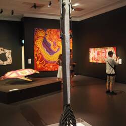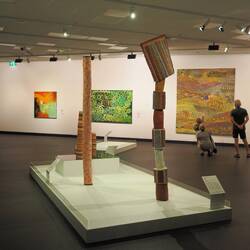 Also Planänderung: Wir gehen gleich ins Museum. Dort gab es eine ganze Reihe von Ausstellungen, die sonst in verschiedenen Museen sind. Zunächst haben sie eine jährlich wechselnde Ausstellung von Kunst von Aboriginal People. Es gibt eine Jury, die die Werke auswählt und es gibt auch ein paar jährlich vergebene Preise. Ich fand es sehr beeindruckend und mich hat erstaunt, wie vielfältig die Werke waren. Zu jedem Werk gab es einen Begleittext. Die waren durchweg im Tonfall sehr trauernd. Der Landverlust durch die Landnahme der Europäer ist eine permanente Wunde, die durch die Kunst verarbeitet werden soll.