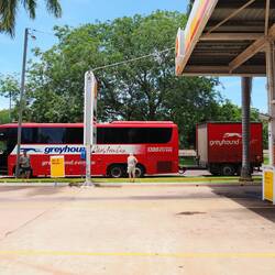 Los ging es in Darwin um 9:55. Der Bus war ziemlich leer. Noch in Darwin fuhr der Bus auf einen Betriebshof. Es wurde noch ein Anhänger mit Fracht angehängt. Auch im Bauch des Busses gab es viele Pakete, der Greyhound bringt hier auch die Post in die Ortschaften.