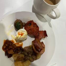 Frühstück kann man hier nicht mit buchen, aber viel Hotels bieten eines an. Das ist dann meist das continental breakfast. Das musste ich erst nachschlagen. Europäer vom Kontinent, also nicht die Briten, essen eher wenig gekochtes zum Frühstück, sondern mehr Brot, Croissants und vielleicht noch was mit Ei. Seit dieser Reise wähle ich zum Frühstück aber doch eher was gekochtes. Was mit Gemüse hätte ich gern, aber das gibt es hier auch nicht viel, eine gegrillte Tomatenscheibe und ein paar Pilze. Brot gibt es eine gewisse Auswahl, aber als deutscher fehlt mir irgendwas zum drauflegen. Es gibt portionsmäßig abgepackte Butter und Marmelade und hier ein großes Glas Nutella. Aber keinen Käse. Mehrfach hatte ich jetzt aber auch schon Bircher Müsli. Hier war der warme Teil des Frühstücks reichhaltiger, also vielleicht nicht so sehr continental. Aufgefallen ist uns die Sauce Hollandaise zu den pochierten Eiern. Passt gut!