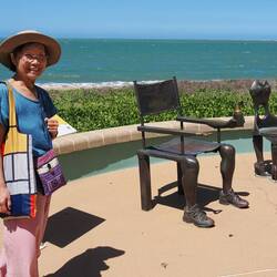 Heute wollten wir entspannt durch die Stadt und am Meer entlang spazieren. Der Strand war wunderschön und, da nicht viele Menschen dort waren, wirkt unheimlich friedlich. Ein Land mit niedriger Bevölkerungsdichte ist wirklich ein glückliches Land. Wir dachten, man dürfe wegen der giftigen Quallen nicht im Meer baden, aber an einigen Stellen sahen wir Badebereiche mit Netzen, die die Quallen fernhielten. Schade, dass wir keine Badesachen dabeihatten. Barfuß spazierten wir am Strand entlang und fanden ein Restaurant mit guter Aussicht, wo wir ein leckeres und gesundes Mittagessen aßen.