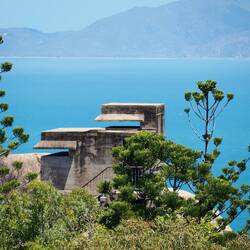 Beim Suchen nach den Koalas haben wir die Bäume weiter oben angeschaut. Tatsächlich saßen die Tiere aber eher auf Augenhöhe. Wahrscheinlich wegen der großen Hitze. Da unten gab es doch mehr Schatten. Wir sind den Weg dann noch bis zu den Verteidigunngsanlagen weitergelaufen.
