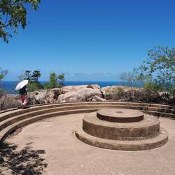 Nachdem wir uns getrennt hatten, um jeweils andere Teile der Insel zu erkunden, trafen wir die beiden später am Fuß des Berges wieder. Die beiden waren außergewöhnlich höflich und rücksichtsvoll, und ich freute mich, sie erneut zu sehen. Wir setzten uns gemeinsam auf eine Bank im Schatten und unterhielten uns lange. Sie reisten mit einem gemieteten Campervan, und es machte Spaß, davon zu erfahren.