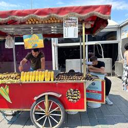 Die Sonne brannte immer noch, also setzten wir uns auf eine schattige Bank am Pier und schauten hinüber zum asiatischen Ufer. Ich kaufte einen Maiskolben – wie auf dem Sultan Ahmed Platz zahlte ich 50 Lira, doch diesmal forderte der Verkäufer 25 Lira zusätzlich. Beim genaueren Hinsehen war das auch tatsächlich so angeschrieben. Seltsam. Aber der Mais schmeckte dafür umso besser. Arnd wollte ursprünglich keinen, fand ihn dann aber auch lecker, also teilten wir uns den einen freundschaftlich.