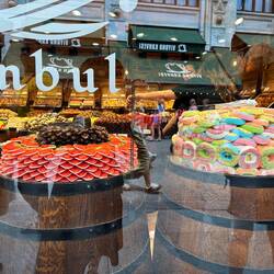 Dann auf in die Stadt und Istanbul ist einfach eine tolle Stadt. Überall quirliges Leben, Laden neben Laden und überall was zu essen. Allerdings wird man in den touristischen Ecken alle 20 Sekunden freundlich angesprochen und auf den Dachgarten mit leckerem Essen hingewiesen. Es ist auch alles gut organisiert, z.B. der öffentliche Verkehr. Der ist einfach zu benutzen, überall gibt es Ticketmaschinen, die einem in vielen Sprachen die Istanbul Kart aufladen und beim ersten Mal auch eine verkaufen. Die hält man dann beim Drehkreuz einmal an die Maschine und es wird ein kleiner Betrag abgebucht. Es gibt alle möglichen Verkehrsmittel, bis hin zu Zahnrad- und Seilbahnen und die fahren so oft, dass man sich um Wartezeiten einfach keine Gedanken macht. Nur bei den Schiffen über den Bosporus muss man bis zu 20 Minuten warten. Vom Autoverkehr bekommen wir nicht viel mit, weil es sehr viele Fussgängerzonen gibt. Für die Autos ist es in den Bereichen wo wir waren sehr eng und deshalb fahren sie nur langsam. Etwas irritierend ist, dass man selbst in vollen Fussgängerzonen Motorroller fahren darf. Aber alle gehen sehr entspannt damit um. Ampeln werden von Fussgängern auch nicht besonders ernst genommen.