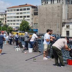 Nachmittags zuerst durch die Altstadt Richtung Galatbrücke gebummelt. Die führt über das goldene Horn, einen Meeresarm. Unser Stadtteil Fatih liegt südlich davon und ist der älteste Teil von Istanbul. Hier lag des alte Zentrum von Byzanz. Die Brücke hat im Untergeschoss ein Restaurant neben dem anderen. In der Mitte der Brücke muss man einmal nach oben steigen, weil das Untergeschoss da für Schiffe unterbrochen ist. Oben stehen Angler auf der Brücke, mitten in der Stadt.
